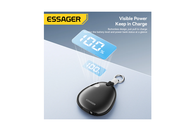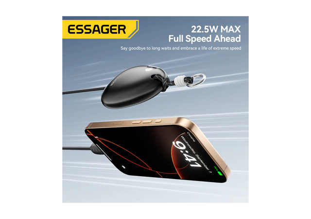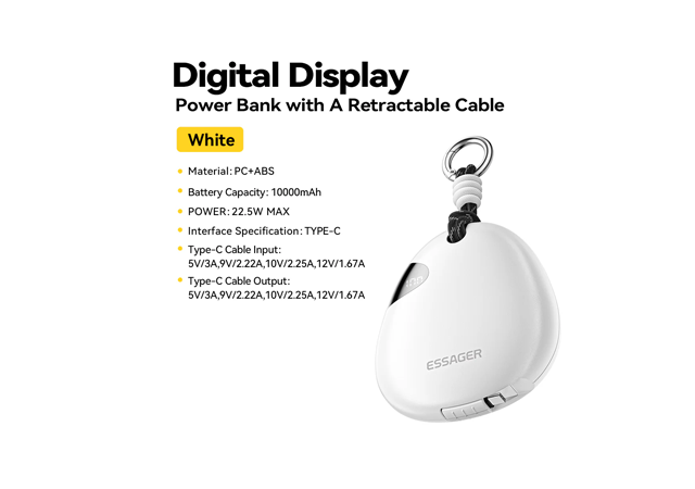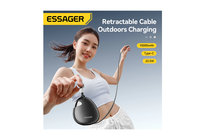 ESSAGER 22.5W Power Bank WITH Retractable Cable, Black, YS01, 1 Year Warranty | EDY1W-YS01-Z